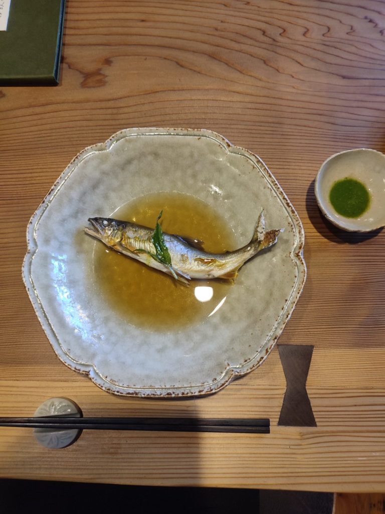 鮎と言えば塩焼きか甘露煮のイメージでしたが、とても美味しかったです。添えてある緑のものがつけだれにも使われているのですが、名前はまた忘れました。ピリッと辛みを感じるのですが、いいアクセントに感じました。